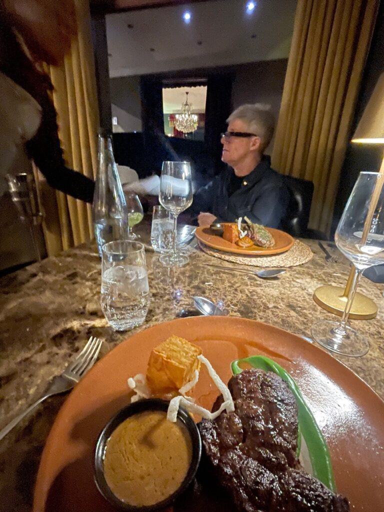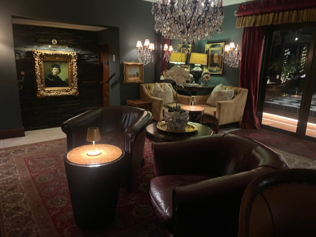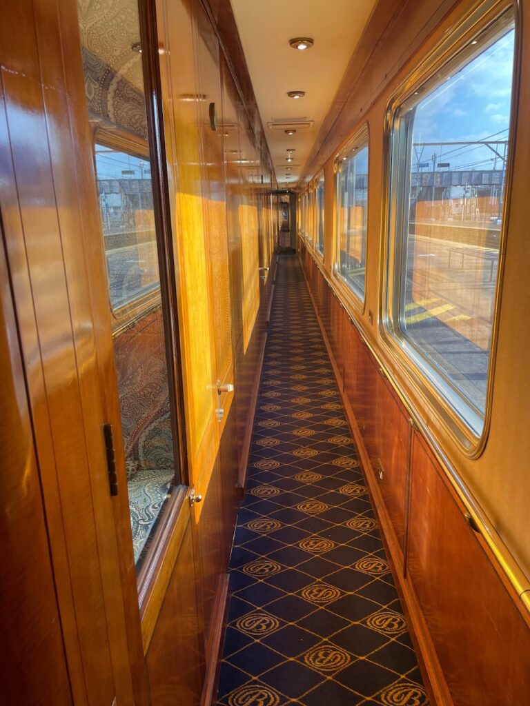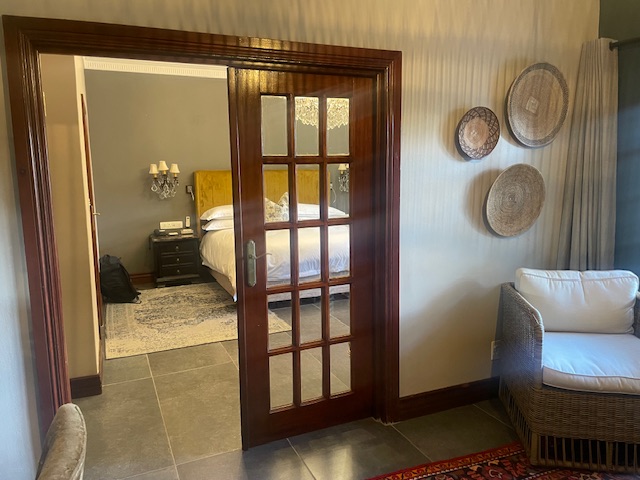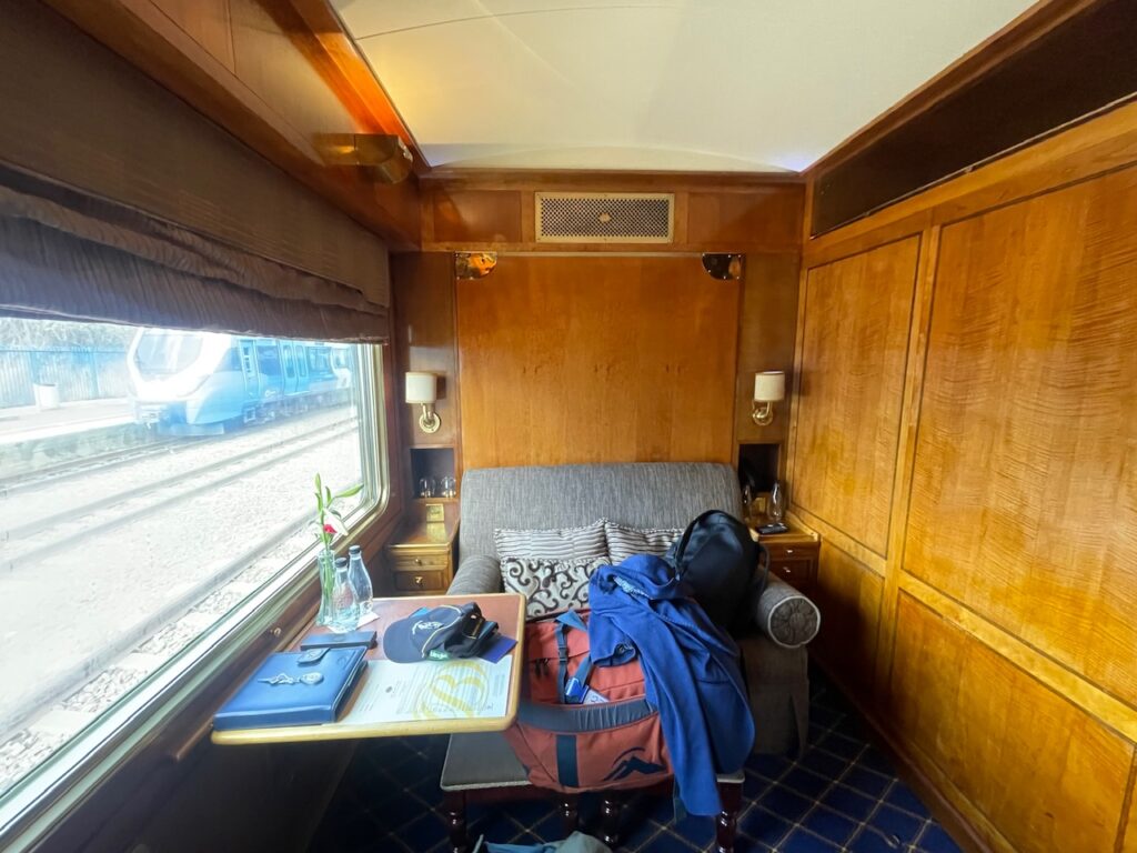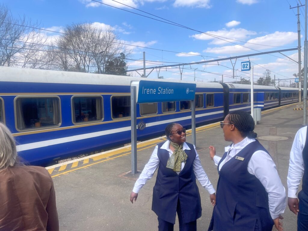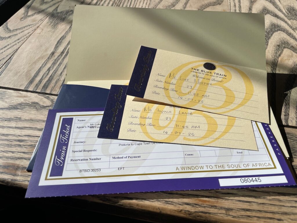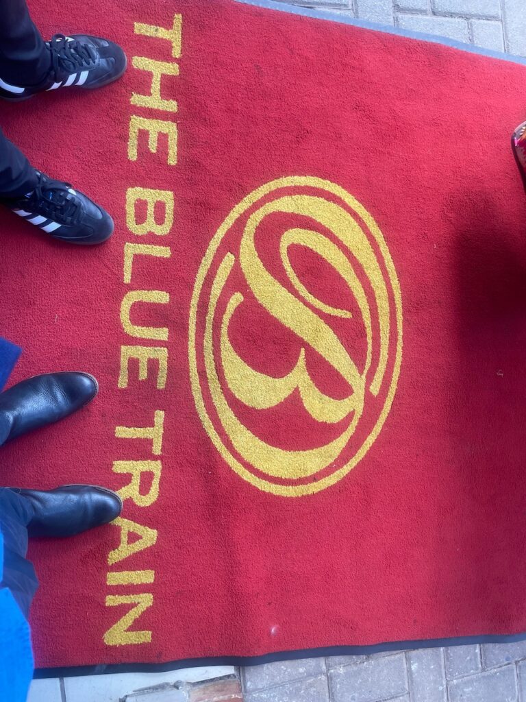 I have been excited about travelling on the Blue Train since I first heard about it – we had booked it in 2020 and had built our itinerary around when we could get on, but the pandemic upset those plans. For those unfamiliar the Blue Train is a luxury overnight train that travels between Pretoria (near Johannesburg) to Cape Town -1,600 km taking 3 days for the one way journey. After a quick session at the hotel gym (yes that isn’t a misprint!) we had an unnecessarily large breakfast (it was included so would have been rude not to…) we repacked our awkwardly designed bags and Ubered to the check-in point for the Blue Train – Irene Country Lodge. We hung there for a couple of hours while they checked our bags and entertained us with a saxophonist playing the Girl from Ipanema then George Michael and Ed Sheeran… very African…