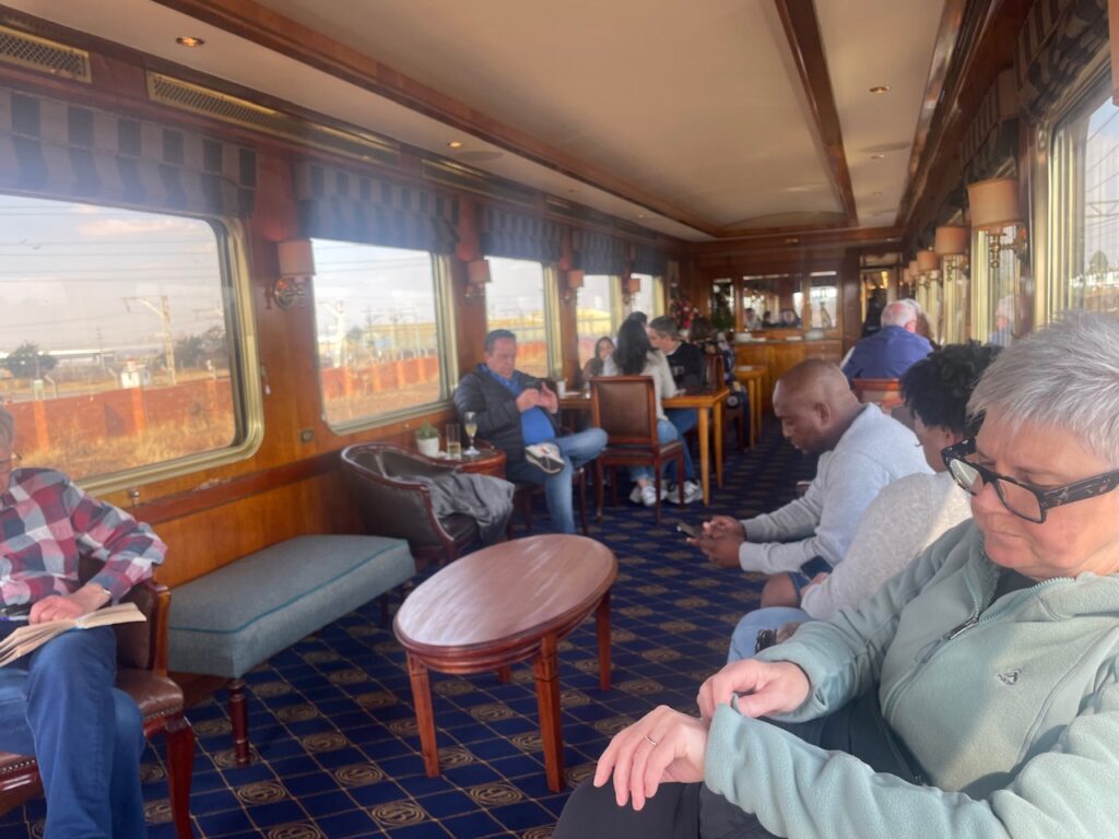We were shuttled to Irene Station at around midday where we boarded the train and met our Butler Thabo for the trip who showed us the featured of the room, which included a bathtub and a fold down double bed. The windows are double glazed and bullet proof – there have been cases of locals throwing rocks at the train. We pulled out of the station at around 1.30pm but alas, despite the luxury, South African infrastructure is unreliable and we made multiple stops due to the theft of the copper rail overhead lines and had travelled less than 100 km by the time we retired for the night.. Despite the frustration, we have met some great folk on the train – mostly from different parts of South Africa and have discovered quite a bit about the country that they don’t publish on Trip Advisor.