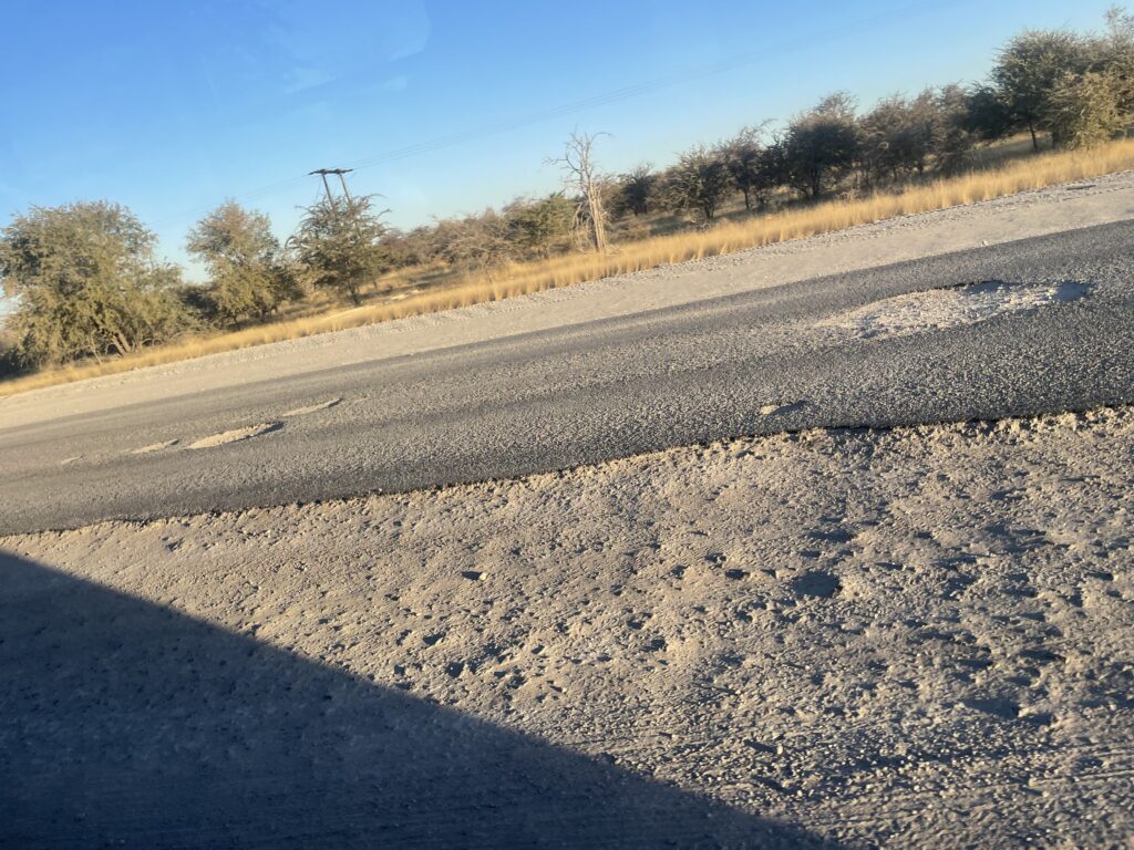 So far it seems that Botswana has some bad roads – I’ll never complain about potholes on Victoria’s roads again! To add to the challenge there are many many donkeys on the roads as well as cows and the occasional goat. Our truck has also developed a hole in its diesel tank so we are losing fuel at an increasing rate and have made multiple stops to patch it. Pulled in late at Maun which it the gateway to the Okavango Delta and ate at the lodge’s Boma restaurant.